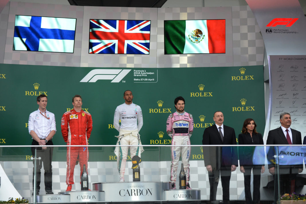 Bakú, Azerbaiyán, 29 de abril del 2018.- Pese a un golpe tempranero y sanción en mitad de carrera de cinco segundos, el mexicano Sergio Pérez logró podio de tercer puesto en el GP de Azerbaiyán, el octavo en su estancia en F1 y superando los siete de Pedro Rodríguez, sumando sus primeros puntos en la temporada, quince de un jalón, y con un carrerón de por medio en esta cuarta fecha de F1 2018, el GP de Azerbaiyán.